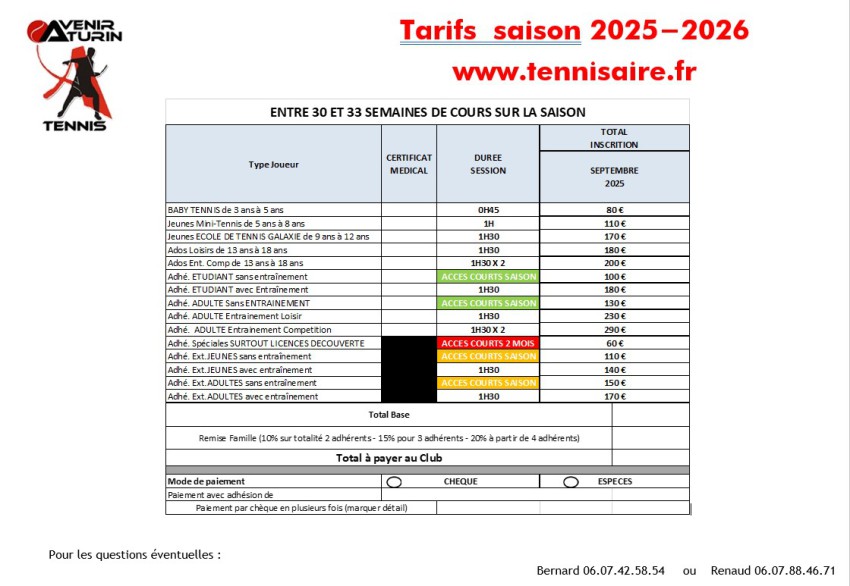 L'adhésion au club comprend la licence de la FFT et l'accès illimité aux courts.